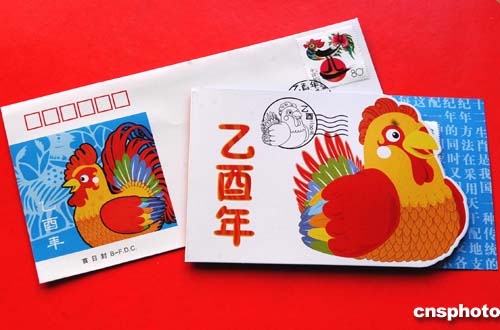 北京市郵票公司為配合國(guó)家郵政局于2005年1月5日發(fā)行《乙酉年》特種郵票(1套1枚),特設(shè)計(jì)印制了該郵票的首日封(左)、郵折(右)郵冊(cè)卡書等郵品,并將與郵票同日發(fā)行!兑矣夏辍诽胤N郵票面值人民幣80分,是中國(guó)發(fā)行的第三輪生肖郵票的第二套。在十二生肖排序中,雞象征著振奮和吉祥,故民俗中有“金雞報(bào)曉”和“金雞起舞”等說(shuō)法。作者:鄒憲