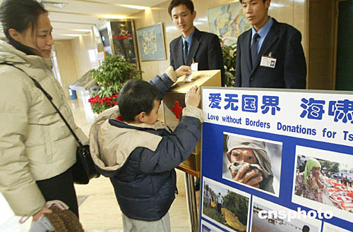 元旦假日期間,北京市民在各區(qū)縣設(shè)立募捐站,為遭受印度洋海嘯受災(zāi)的國(guó)家捐款。中新社記者:錢(qián)興強(qiáng)