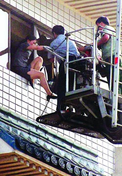 “我拍第二張照片時看見大廈員工順著床單下去的時候突然斷裂,一名員工突然從半空中掉下,但居然還站起走了幾步,然后才倒地。”