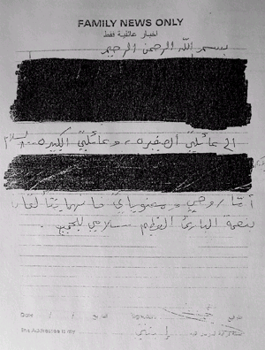信的開頭寫道:“以慈悲的神的名義”,接下來有6行字被劃掉,再往下是“向我的小家庭和大家庭問好”,下面又有3行字被劃掉,接下來的文字是“感謝老天,我的精神很好,我的士氣很高。向所有人問好!。這封信經(jīng)過了駐伊美軍的嚴(yán)格審查,其實際內(nèi)容基本已經(jīng)不存在。魯沙旦說:“三分之二的內(nèi)容被劃掉了,只剩下17個字,根本無法理解其原意!(章田)