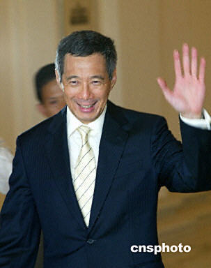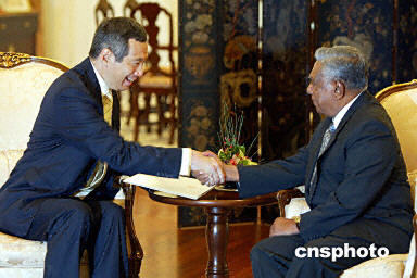8月10日,新加坡總理吳作棟(左)在總統(tǒng)府正式向新加坡總統(tǒng)納丹遞交辭呈,從而為副總理李顯龍?jiān)诮照浇尤慰偫硪宦氫伷搅说缆贰?/p>