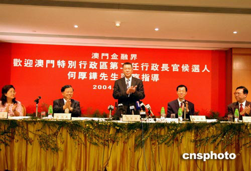 十八日,澳門特別行政區(qū)第二任行政長官候選人何厚鏵在中銀大廈與澳門銀行公會、澳門保險公會等金融界代表會晤,聽取他們對未來五年澳門金融業(yè)發(fā)展的意見。中新社記者:梁永強