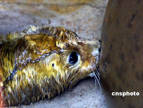 2005年1月24日早晨,在秦皇島海洋歡樂公園的水族館內(nèi),一只出生僅一天的小斑海豹全身覆蓋著土黃色的皮毛,在媽媽的產(chǎn)房內(nèi)享受著母愛。據(jù)了解,這只可愛的小海豹在秦皇島市是人工喂養(yǎng)條件下降生的第一只小海豹,它的媽媽名叫“公主”,是6年前來到港城的,經(jīng)過幾年的人工喂養(yǎng),2004年10月份訓(xùn)養(yǎng)員發(fā)現(xiàn)溫順的公主懷孕了,在為其安排了一間單獨的產(chǎn)房后,1月23日早晨4點左右時,工作人員聽到公主奇特的叫聲,5點多時,發(fā)現(xiàn)公主身邊多了一只小海豹和一堆胎盤。斑海豹別名海豹、港海豹,海豹科Phocidae,分布主要在渤海、黃海、東海也有發(fā)現,個別遠達南海,屬國家二級保護動物。也是惟一在我國渤海沿岸繁殖的鰭腳類動物。學(xué)忠 攝
