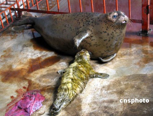 圖:秦皇島第一只人工喂養(yǎng)條件下降生的小斑海豹
