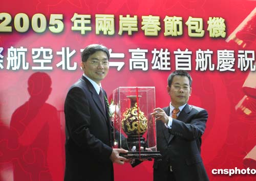 圖:兩岸民航業(yè)者為春節(jié)包機(jī)高雄首航慶賀