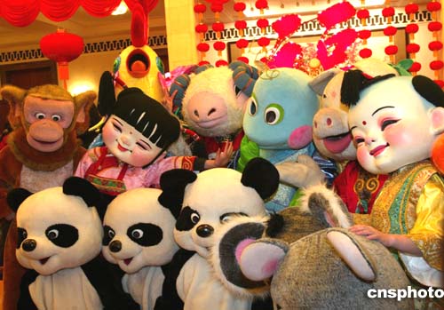 走進張燈結彩的人民大會堂,噴泉涌動,鮮花爭艷,迎面兩個賀歲的“阿!睋碇皦坌恰毕蛉藗児зR新喜,彩燈閃爍的“福”字表達著新春的祝福。大型充氣“雞型”、“龍型”滑梯和“燈籠”、“蘑菇”城堡成了孩子們的樂園。