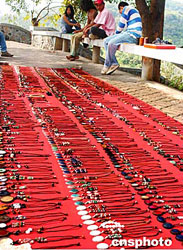 2月中旬的泰國布吉島一處旅游景點上,一處銷售旅游紀念品的地攤分外醒目。