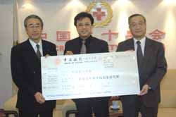 二月二十二日,中國(guó)日本商會(huì)和北京日本人會(huì)向中國(guó)紅士字會(huì)捐款二十六萬(wàn)余元人民幣,支援“印度洋海嘯”后重建資金。圖為中國(guó)紅十字會(huì)副會(huì)長(zhǎng)郭長(zhǎng)江(中)接受中國(guó)日本商會(huì)會(huì)長(zhǎng)武田勝年(右)等捐款。作者:張宇