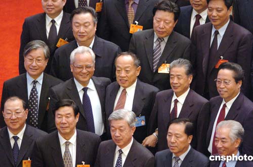 十屆全國人大三次會議第四次全體大會三月十三日上午在北京人民大會堂舉行,列席會議的部長們會后在大會主席臺前合影留念。作者:陳文