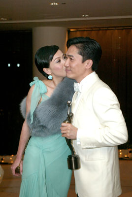 “偉仔”與嘉玲在頒獎(jiǎng)禮結(jié)束不久即抵達(dá)慶功宴會(huì)場(chǎng),五度稱帝的他一直面露笑容,上臺(tái)領(lǐng)獎(jiǎng)時(shí)的緊張一掃而空,嘉玲更即場(chǎng)吻賀男友!皞プ小苯忉,他上臺(tái)時(shí)的心情就好像第一次拿獎(jiǎng)一樣緊張,因他已因?yàn)椤痘幽耆A》里的周慕云而奪得影帝,今次在《2046》里再演同一個(gè)角色,要能夠拿兩次獎(jiǎng),難度非常高。因此,他對(duì)獲獎(jiǎng)感到十分開心,但同時(shí)又承認(rèn)并不覺得太意外,因他之前已憑《2046》奪得香港電影評(píng)論學(xué)會(huì)的“最佳男演員”獎(jiǎng),自然也想再在金像獎(jiǎng)得獎(jiǎng)。對(duì)于成為五屆影帝,他只以“好彩”來形容,說自己運(yùn)氣好,王家衛(wèi)“腳頭”也好。另外,出爐影后章子怡繼續(xù)其“少話”本色,慶功宴上仍來去匆匆,不肯多談感受,只表示很開心,已經(jīng)即時(shí)致電家人及朋友報(bào)喜。