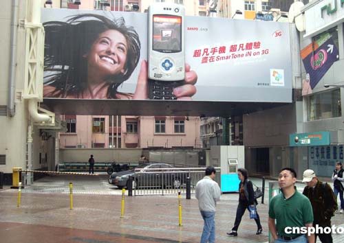 香港街頭廣告種類(lèi)繁多,在銅鑼灣鬧市區(qū)所展現(xiàn)的巨型立體手機(jī)廣告更令人奪目。作者:譚達(dá)明