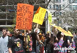 世界銀行春節(jié)會(huì)議在華盛頓舉行之際,美國(guó)示威者于美東時(shí)間4月16日中午到世行大樓外集會(huì),抗議美國(guó)國(guó)防部副部長(zhǎng)沃爾福威茨出任世界銀行新任行長(zhǎng)。作者:余東暉