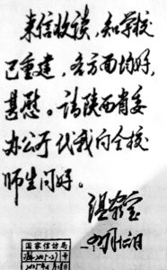 面對取得的這些成績,吝王小學(xué)的師生們想到了當(dāng)年溫總理的關(guān)懷和勉勵,就寫信讓總理放心。3月30日,這封寄托著全校師生情感的普通信件從華縣郵局寄往北京。4月16日,總理看到信件的當(dāng)天就做了批示:“來信收讀,知學(xué)校已重建,各方面均好,甚慰。請陜西省委辦公廳代我向全校師生問好。溫家寶四月十六日”。