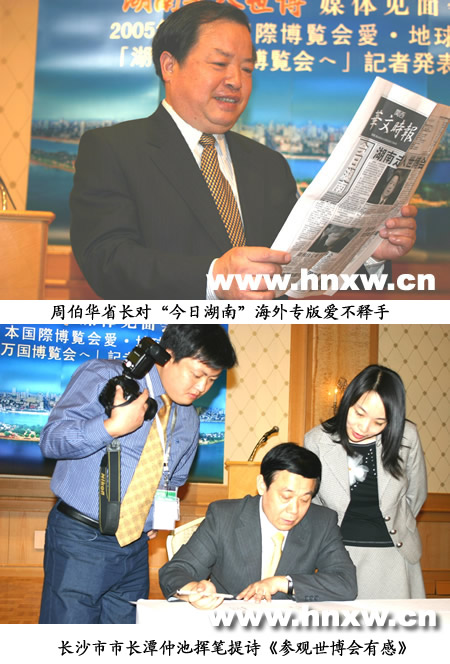 5月20日上午十點,在名古屋市舉行的2005年愛知世博會“湖南走入世博”媒體見面會上,湖南省省長周伯華看到“今日湖南”海外專版樣報時愛不釋手,他說:“我在世博會中國館館日時就看到了這個專版,特別高興,這個海外專版辦得很好!敝懿A省長還高興地手捧“今日湖南”海外專版樣報在“湖南走入世博”媒體見面會的會標(biāo)前讓記者攝影拍照留念。
