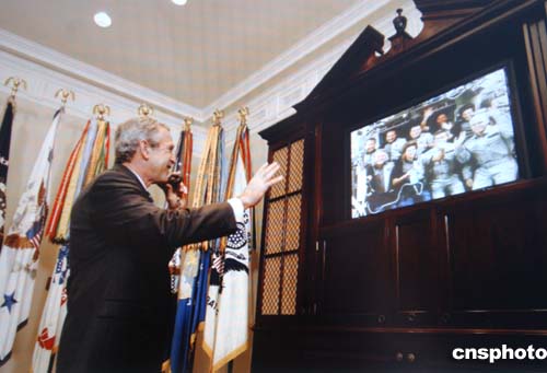 美國總統(tǒng)布什在白宮辦公室給太空中的發(fā)現(xiàn)號航天飛機機組打慰問電話。作者:賈國榮