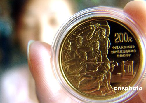 中國人民銀行于2005年8月15日發(fā)行中國人民抗日戰(zhàn)爭暨世界反法西斯戰(zhàn)爭勝利60周年金銀紀(jì)念幣一套。該套紀(jì)念幣共2枚,其中金幣1枚,銀幣1枚,均為中華人民共和國法定貨幣。作者:馬健
