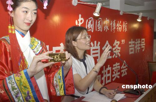中新社北京八月二十八日電(記者沈嘉)中國國家博物館首次發(fā)行的收藏型“國寶生肖金條”四款特號今日在京拍賣。作為競逐焦點的000二號全套金條以三十六萬元(人民幣,下同)的高價成交,其余拍品也各歸其主。