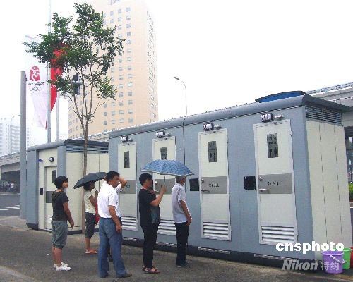 7月8日,在北京“鳥(niǎo)巢”東側(cè)便道上,一排為奧運(yùn)準(zhǔn)備的公廁開(kāi)始供人們使用,過(guò)往游客紛紛排隊(duì)體驗(yàn)"方便"。 中新社發(fā) 玉龍 攝
