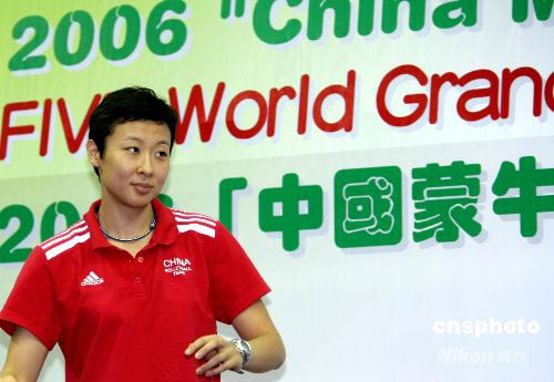 2006年8月16日,前來香港參加世界女排大獎(jiǎng)賽的中國(guó)女排隊(duì)長(zhǎng)馮坤登臺(tái)亮相。中新社發(fā) 洪少葵 攝