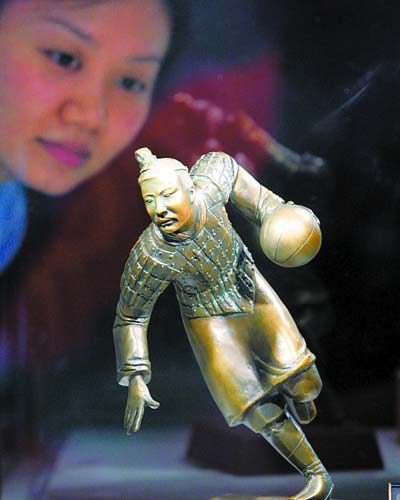 古老的兵馬俑練起了體操,踢起了足球。奧運臨近,北京商家競相開發(fā)各類具有中國特色的禮品,迎接各國來賓。限量100套的兵馬俑青銅運動雕塑在燕莎商城亮相,這是由一位年輕的雕塑師專門為奧運“創(chuàng)意”的新作。 (記者 竇紅梅 戴冰攝)