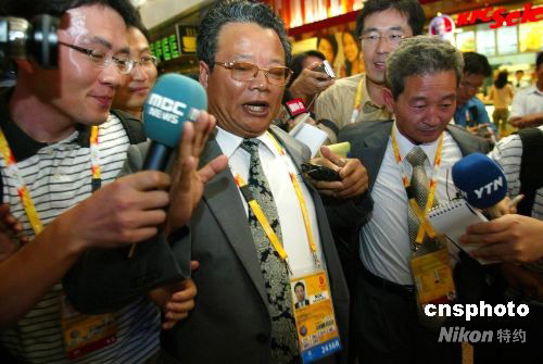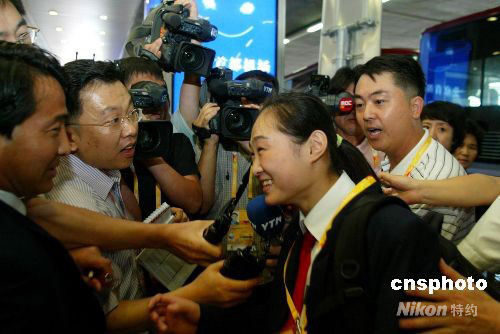 曾摘得2007年德國(guó)斯圖加特體操世錦賽女子跳馬銀牌的朝鮮體操名將洪淑貞(中),隨朝鮮奧運(yùn)代表團(tuán)一起抵達(dá)北京備戰(zhàn)奧運(yùn)會(huì)。