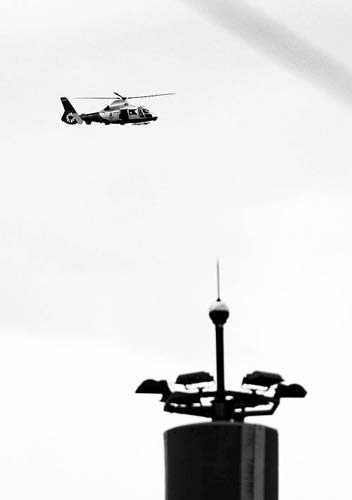 8月1日,執(zhí)行安保任務(wù)的國(guó)產(chǎn)警用直升機(jī)盤(pán)旋在北京奧運(yùn)場(chǎng)館上空。 喻志勇攝