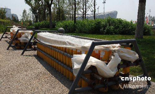 8月3日,離北京奧運會開幕還有5天,國家主體育場——“鳥巢”建筑附近做好了北京奧運會開幕式的準備工作。圖為鳥巢北側布置22x4聯(lián)發(fā)禮花炮放射裝置,每一個發(fā)射裝置上均有禮花彈詳細名稱。 中新社發(fā) 鄒憲 攝
