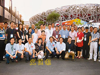 以香港文匯報(bào)社長張國良為團(tuán)長的香港新聞界訪京團(tuán)抵京率先察看奧運(yùn)之旅。圖為訪京團(tuán)成員在鳥巢前合照。(圖片來源:文匯報(bào))