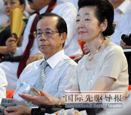 8月8日,福田康夫和夫人在北京奧運(yùn)會(huì)開(kāi)幕式上。記者 黃敬文/攝