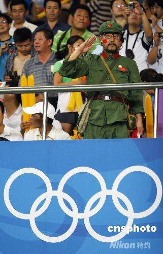 8月13日,北京奧運會男子足球賽,中國對巴西的比賽在秦皇島奧體中心舉行,最終中國隊0:3負(fù)于巴西隊。圖為一位身著老式“軍裝”的球迷亮相秦皇島奧體中心。 中新社發(fā) 劉新 攝