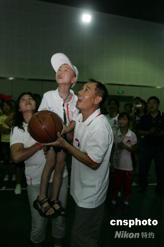 8月14日下午,李寧、楊揚和潘曉婷與艾滋孤兒玩起了羽毛球、乒乓球等體育游戲!翱鞓穵W運會”由李寧基金會發(fā)起,與阜陽市艾滋病貧困兒童救助協(xié)會聯(lián)手,邀請阜陽的30名艾滋孤兒來到北京,觀看了奧運會的射擊比賽,并游覽北京名勝古跡。圖為李寧(右)在教艾滋孤兒打籃球。中新社發(fā) 沈晨 攝