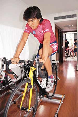 按計(jì)劃,“阿寶”與黃蘊(yùn)瑤今天本應(yīng)進(jìn)行公路訓(xùn)練,但因天雨以及單車(chē)館內(nèi)有其它車(chē)隊(duì)正在訓(xùn)練的關(guān)系,唯有在室內(nèi)器械上進(jìn)行練習(xí)。其中“阿寶”邊練邊反復(fù)觀看錄像帶!八诳慈ツ辍眠\(yùn)北京’測(cè)試賽的錄像,16日的比賽,我們打算以測(cè)試賽的戰(zhàn)術(shù)為藍(lán)本,他反復(fù)地看,已不知看多少次了!鄙蚪叹毥忉尩。