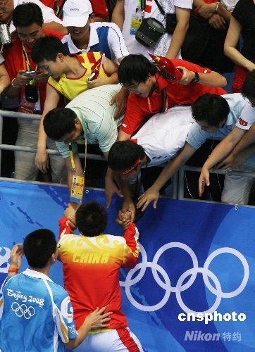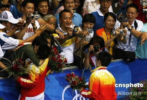 8月15日晚,中國組合杜婧、于洋在北京奧運(yùn)會(huì)羽毛球女子雙打決賽中以2比0戰(zhàn)勝韓國組合李孝貞、李敬元,奪得金牌。圖為杜婧、于洋與觀眾互動(dòng)。中新社發(fā) 武仲林 攝