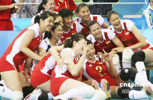 賽后女排姑娘在賽場喜拍大合照。中新社發(fā) 武仲林 攝