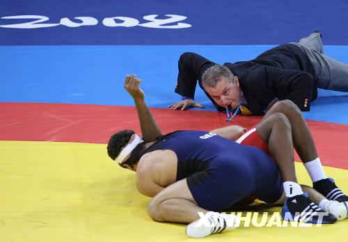 8月21日,在北京奧運(yùn)會摔跤男子自由式96公斤級銅牌決賽中,格魯吉亞選手喬治·戈格舍利澤(藍(lán))戰(zhàn)勝古巴選手米歇爾·巴蒂斯塔,獲得銅牌。裁判為了看清楚也趴到摔跤臺上。新華社記者李鋼攝