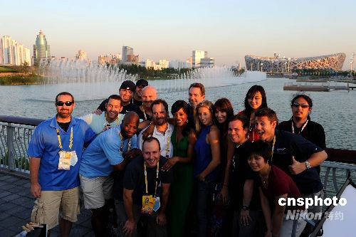 北京奧運(yùn)接近尾聲,美國NBC電視臺(tái)等媒體記者合影留念惜別奧林匹克公園。中新社發(fā) 廖攀 攝