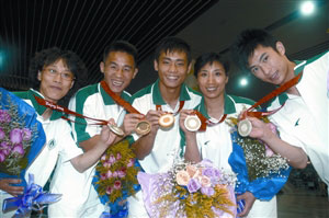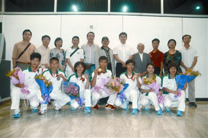 隨著北京奧運會閉幕,同期進行的“北京2008武術(shù)比賽”正式結(jié)束,代表澳門參與比賽的7位運動員及教練團成員,帶著世界最高規(guī)格的武術(shù)賽獎牌,25日晚8時返抵澳門國際機場。澳門武術(shù)總會副理事長李文欽、體育委員尹君樂到場迎接。