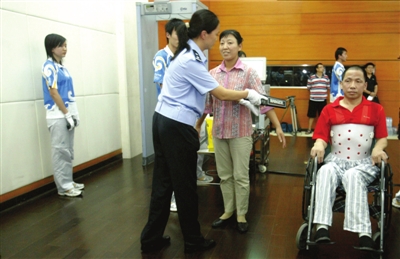 在殘奧會(huì)期間,安檢員對(duì)殘疾人進(jìn)行安全檢查全部徒手進(jìn)行,并堅(jiān)決避免異性安檢員檢查殘疾人。記者昨天從北京警方針對(duì)殘奧會(huì)場(chǎng)館安檢員的培訓(xùn)班上獲悉,為服務(wù)殘障人士,警方要求安檢員必須隨時(shí)清理安檢現(xiàn)場(chǎng)的垃圾,以免妨礙殘疾人行動(dòng)。