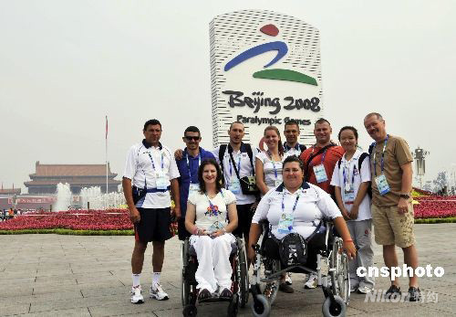 9月3日,羅馬尼亞殘奧會運動員在志愿者的陪同下來到天安門廣場參觀游覽,體驗北京殘奧會氣氛和熱情友好的北京,并在殘奧會會徽“天地人”前合影留念。 中新社發(fā) 王宇婷 攝