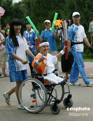 9月6日,殘奧會(huì)火炬結(jié)束在北京的傳遞,參加火炬?zhèn)鬟f的殘疾人占火炬手五分之一。中外殘疾人火炬手在傳遞中成了亮麗的風(fēng)景線,沿途觀眾為他們喝彩加油。 中新社發(fā) 馬毅行 攝