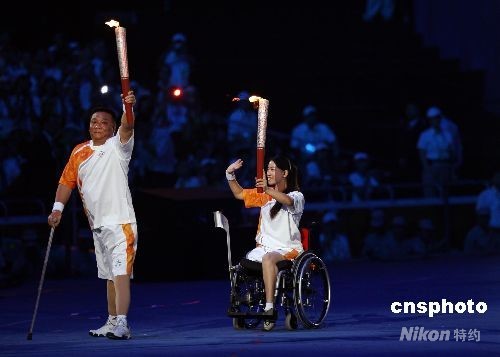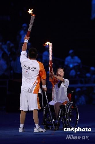 圖為開(kāi)幕式上,中國(guó)輪椅擊劍運(yùn)動(dòng)員、英勇保衛(wèi)北京奧運(yùn)火炬的金晶(右),與殘奧會(huì)游泳金牌獲得者武云虎進(jìn)行火炬交接。中新社發(fā) 杜洋 攝