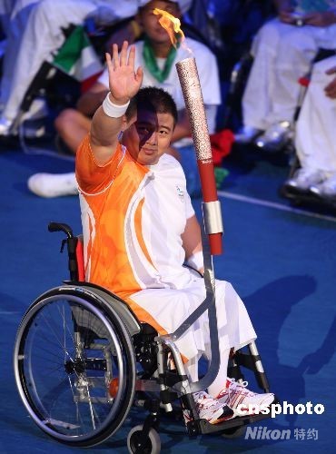 圖為殘疾運動員傳遞火炬。中新社發(fā) 宋吉河 攝