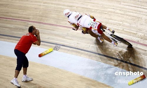 圖:教練場邊指導(dǎo)場地自行車選手比賽