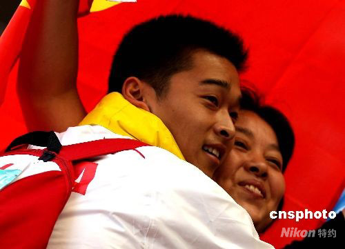 9月11日上午,北京殘奧會(huì)田徑比賽繼續(xù)在奧林匹克公園內(nèi)的國(guó)家體育場(chǎng)“鳥巢”舉行,在男子鐵餅F35-36級(jí)決賽中,F(xiàn)35級(jí)中國(guó)選手郭偉以54米13獲得1131分奪得金牌,并打破世界紀(jì)錄。獲得勝利的郭偉與在場(chǎng)觀戰(zhàn)的媽媽擁抱慶祝。 中新社發(fā) 任晨鳴 攝