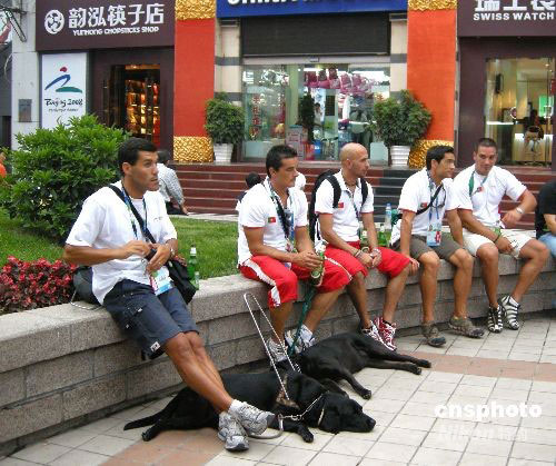 2008年9月16日下午,幾名參加北京殘奧會(huì)的外國(guó)運(yùn)動(dòng)員來到王府井游覽購物,忠實(shí)的導(dǎo)盲犬一直尾隨在其中的盲人運(yùn)動(dòng)員左右。中新社發(fā) 玉龍 攝