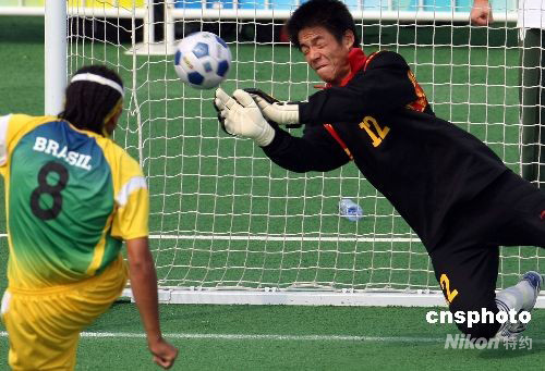 9月17日下午,北京殘奧會(huì)五人制足球決賽在北京奧林匹克公園內(nèi)舉行,雅典殘奧會(huì)冠軍巴西隊(duì)依靠強(qiáng)大的實(shí)力,最后以2比1擊敗中國(guó)隊(duì)蟬聯(lián)冠軍。中新社發(fā) 任晨鳴 攝