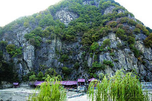 湯河溫泉有兩個(gè)泉眼,在河道西側(cè)山腳下,常年不停地冒熱水。上個(gè)世紀(jì)80年代末,當(dāng)?shù)卣畬⑷廴ζ饋硇顭崴,通過管道流入修建的四個(gè)浴池里,供當(dāng)?shù)卮迕裣丛。笥衷谠〕厣闲藿ㄏ丛⊥ぜ伴L(zhǎng)廊。