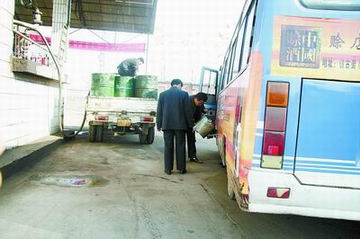 記者在現(xiàn)場(chǎng)看到,一輛2路公交車從該門市用油桶加過柴油后離開。