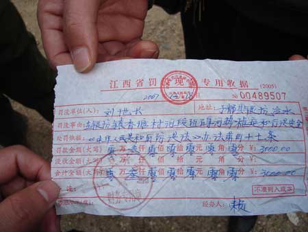 劉地長告訴記者,去年,于都縣水務(wù)局第一次來查采砂點時沒有罰款。去年12月18日,水務(wù)局開了一張3000元的罰單,說是采砂點阻礙河勢穩(wěn)定和堤壩安全。