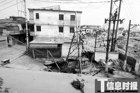 “這些房子是慢慢下陷地面的!弊≡谖髋d街的一名士多店老板阿牛說,早上7時左右,他看見那些房子突然開裂,接著就看見這些房子逐漸下沉,隨后“轟”的一聲,變壓器倒了,地面像地震一樣開出了一個巨大的窟窿,之后窟窿擴(kuò)大蔓延。
